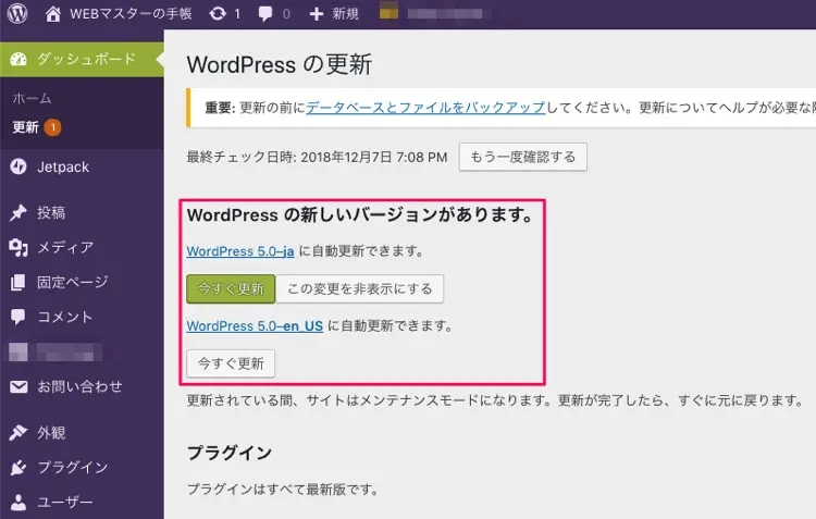 2018年12月7日(今日)、WordPressの管理画面を開くと「WordPress5.0」へのアップデート(更新)の通知が来ていると思います。